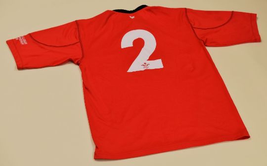 WALES INTERNATIONAL JERSEY WORN BY CAPTAIN JONATHAN HUMPHREYS v ENGLAND February 22nd 2003, by Reebok and bearing No.2 on reverse, embroidered No. 927 below crest, match details on each of the short-sleeves, 'Rockport' sponsorship across chest