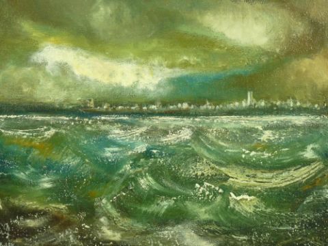 KAREL LEK oil on canvas - dramatic Mersey/Liverpool scene under clouds, signed, 34.5 x 44.5 cms