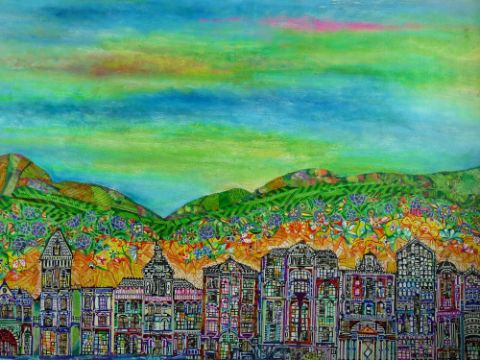 DANIEL MEAKIN mixed media on canvas - 'Promenade and Beyond', signed and entitled verso and with biographical notes, 90 x 90 cms