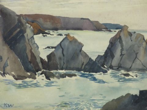 In the manner of SIR KYFFIN WILLIAMS RA watercolour - rocky coastalscape, Pembrokeshire or Anglesey, bears initials, 24.5 x 34.5 cms