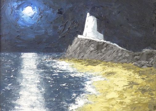 WYN HUGHES oil on board - moonlit Llanddwyn Island lighthouse, signed, 20.5 x 28 cms