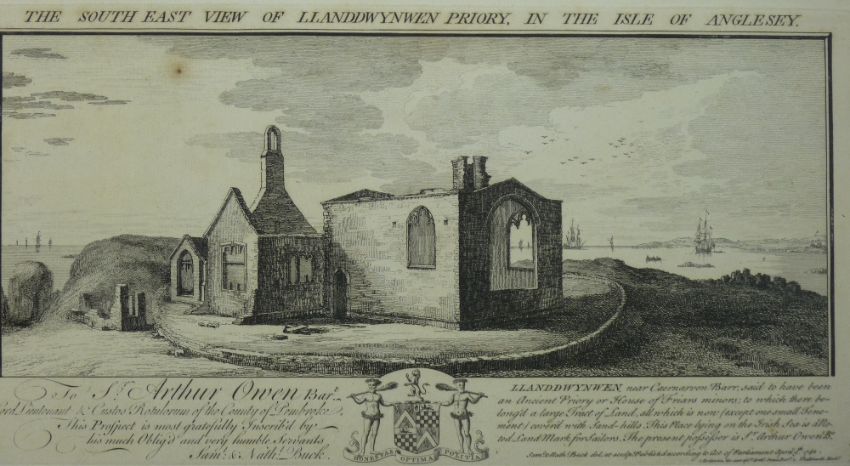 JOHN SPEED a coloured and tinted map of Anglesey requiring full restoration, 38 x 51 cms and a print by BUCK - 'The South East View of Llanddwynwen Priory, Isle of Anglesey', 24.5 x 42 cms