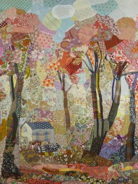 EDRICA HUWS mixed media - large fabric/linen treescape collage with outbuilding, 94 x 70 cms