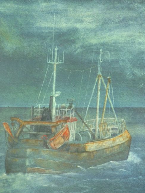 ELFYN ROBERTS watercolour - fishing trawler making out to sea, signed with initials, 36 x 23 cms