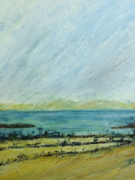 ANN CHADWICK acrylic/mixed media on canvas - Rhoscolyn, Anglesey and the distant Caernarfonshire mountains, signed, 59 x 59 cms