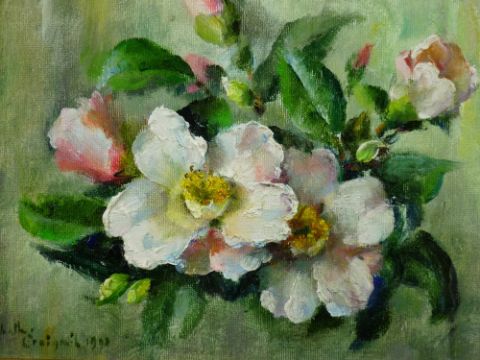 HEATHER CRAIGMILE oil on board - still life, study of wild roses, signed and dated 1998?, 19.5 x 24 cms and HEATHER CRAIGMILE oil on canvas - still life, flowers in a vase on a table, signed and dated 1966, 29 x 39 cms