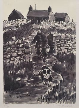 SIR KYFFIN WILLIAMS RA limited edition (83/150) print - farmer carrying a pail with his dog ahead, signed in full, 49 x 39cms