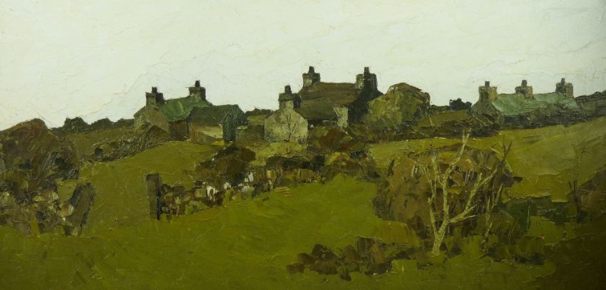 TOM GERRARD oil on board - Anglesey farmstead and cottages entitled verso 'Parc Gwalchmai, Sir Fon', 44 x 90 cms
