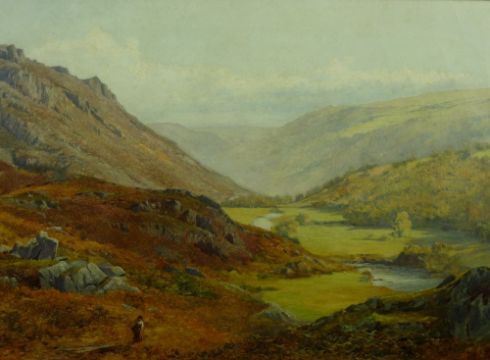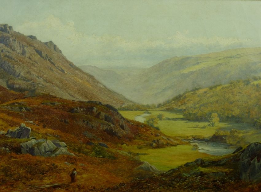 JOHN SURTEES oil on canvas - autumn morning in the Lledr Valley with figure in the foreground, signed and dated 1871, 39 x 65 cms