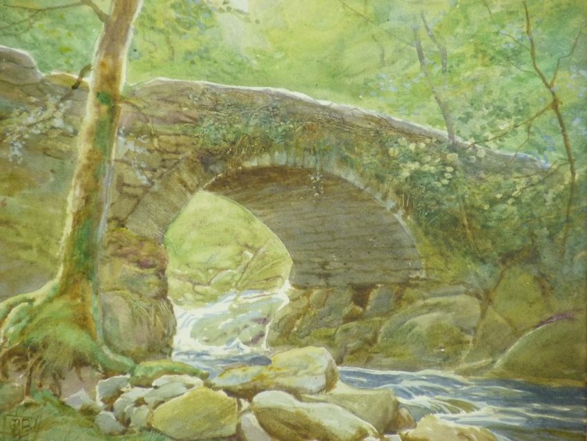 T MURRAY BERNARD BLADON (b. 1864) Birmingham School of Art, lived at Llanbedr, Meirionnydd from 1930, watercolour - bridge over a river, monogrammed and signed verso with title 'Cwm Rafn', 17.5 x 22.5 cms
