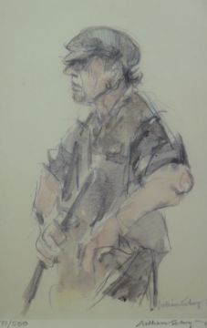 WILLIAM SELWYN coloured limited edition (77/500) print - three quarter length study of a standing farmer with stick, signed in full, 33.5 x 21 cms