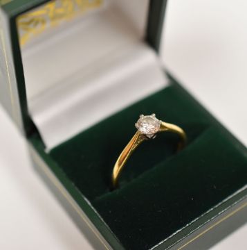 DIAMOND SOLITAIRE RING with single brilliant cut diamond, claw set in 18ct yellow gold, London, visual estimate 0.6cts (supported by an insurance certificate)