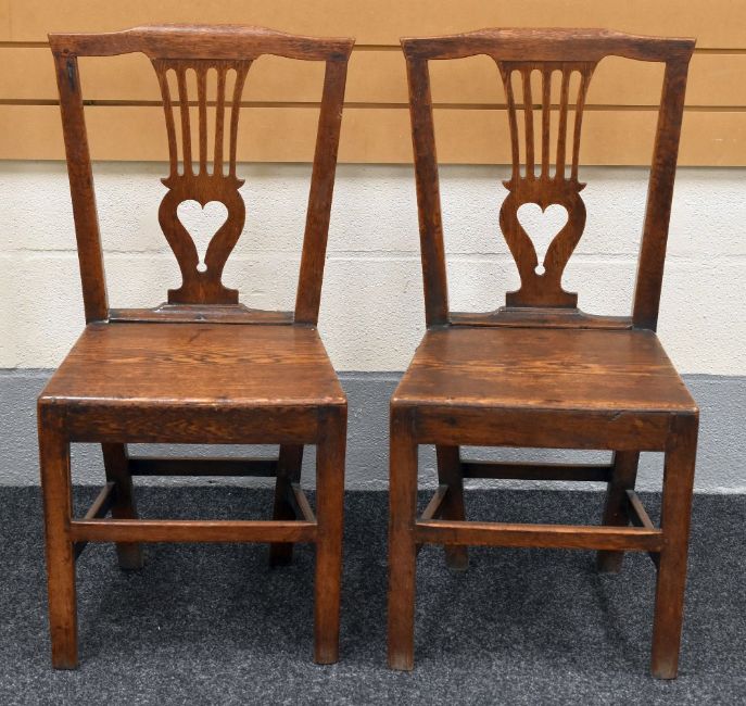 A PAIR OF ANTIQUE OAK SQUARE SEATED HALL CHAIRS with a lyre centre splat-back, 91 x 41 cms