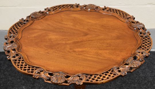 ORNATELY CARVED AND PIERCE REPRODUCTION TILTING TABLE with centre column tripod ball and claw feet, 76 x 70 cms