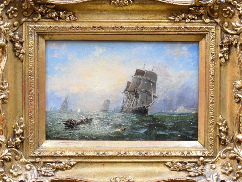 WILLIAM CALCOTT KNELL oil on canvas - galleons at sea, signed, 18 x 28 cms