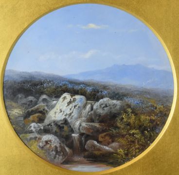 WILLIAM WIDGERY oil on card, circular format - landscape with stream, signed verso, 15cms diam