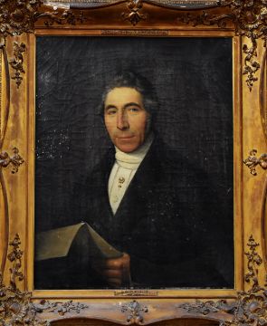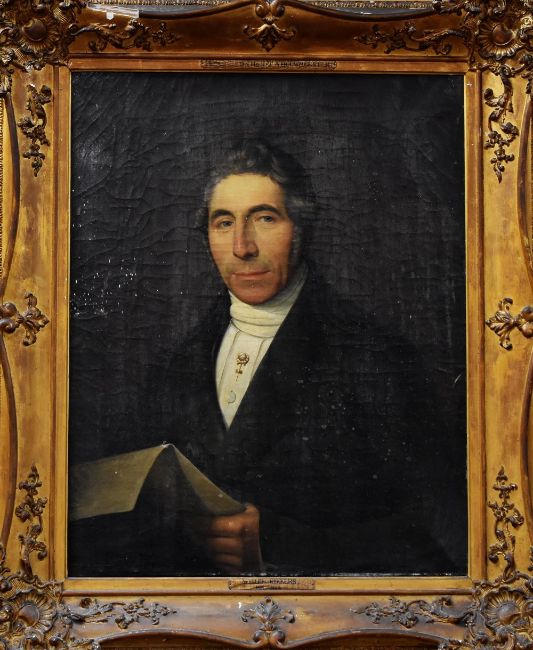 WILLEM RIKKERS b. 1812 d.1873, oil on canvas - two mid nineteenth century half-length portraits of an affluent Dutch husband and wife, the first entitled 'Portret van den Heer W.A.Bouwmeester', the other entitled 'Portret van nevr L, Bouwmeester geb KOOL', 69 x 55cms