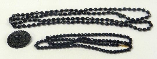 A WHITBY JET CARVED OVAL BROOCH together with two strands of mourning beads