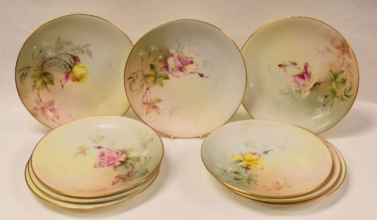 SET OF NINE ROYAL WORCESTER PLATES, of circular form with gilded borders and painted with wild roses, shape No.2, date mark for 1912