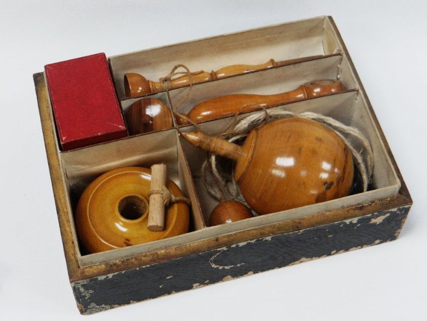A BOXED VICTORIAN COMPENDIUM OF CHILDREN'S TOYS the wooden box with printed pictorial label to the lid demonstrating the contents usages and entitled in French, German and English 'New Magazine of Gymnastic Games', the compartmented box interior containing wooden items for play, such as a yo-yo, skittles, marbles etc (as per the label)