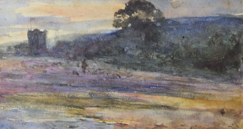 ENGLISH SCHOOL watercolour - figure walking in tree edged field, with castle in background, initialled HT. 10 x 17cms.