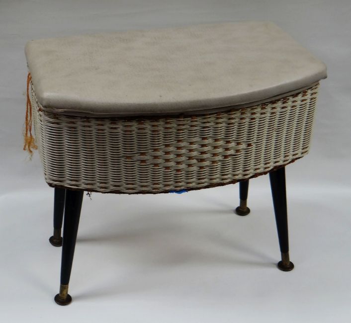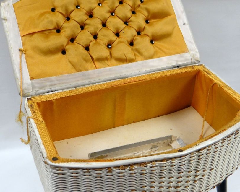 VINTAGE LOOM STANDING SEWING BOX with hinged cushioned lid and cushioned interior raised on four tapered supports