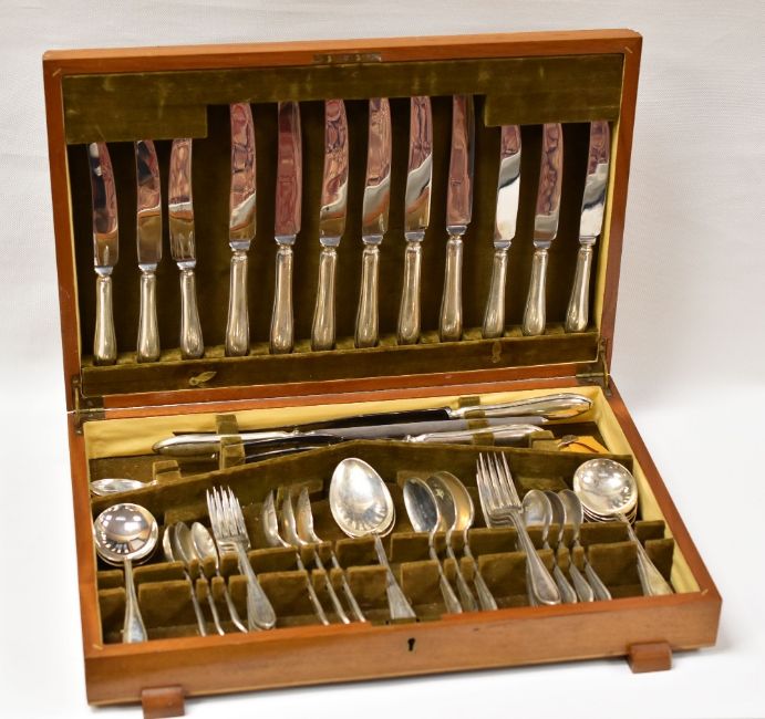NEAR COMPLETE SILVER / PART SILVER CANTEEN OF CUTLERY, approx 63.2ozs in weight excluding twelve part silver knives and three-piece part silver carving set, Sheffield, 1947, in a fitted mahogany case