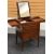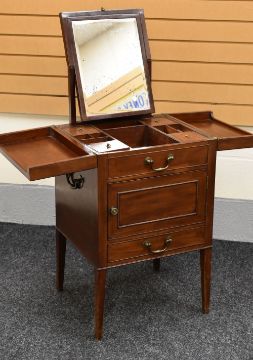 VANITY CABINET WITH BRASS FITTINGS on raised tapered supports, the top splitting into hinged lids revealing a compartment interior and a pull-up toilet mirror, 80 x 50 cms