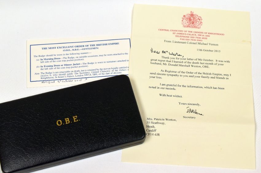 MODERN CASED OBE AWARDED TO MR DONALD MARSHALL WESTON by Toye, Kenning & Spencer, together with card and letter from the Central Chancery of the Orders of Knighthood