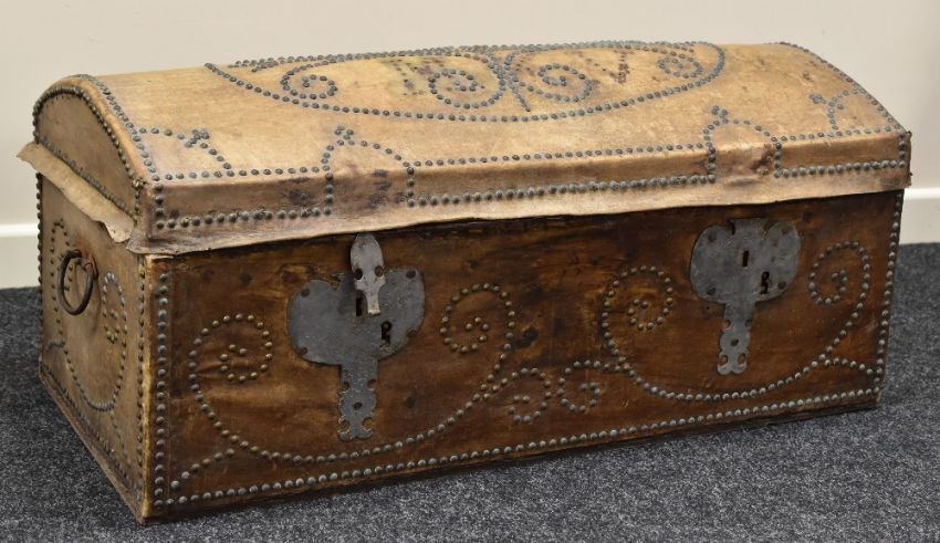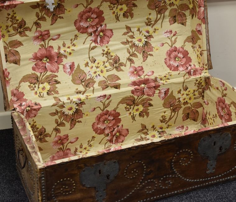 A STUDDED DOME TOPPED CHEST WITH IRON CARRY HANDLES, 102 x 45 cms