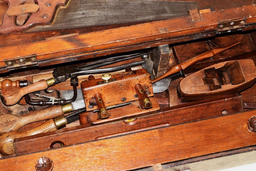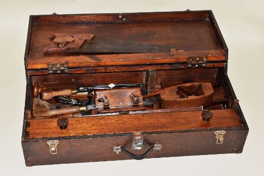 AN EARLY TWENTIETH CENTURY WOODEN CARPENTRY BOX WITH GOOD CONTENTS OF VINTAGE TOOLS including brass mounted items