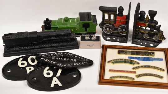 A TRAY OF RAILWAY MISCELLANY, including signage, book-ends, paper weight, money box etc