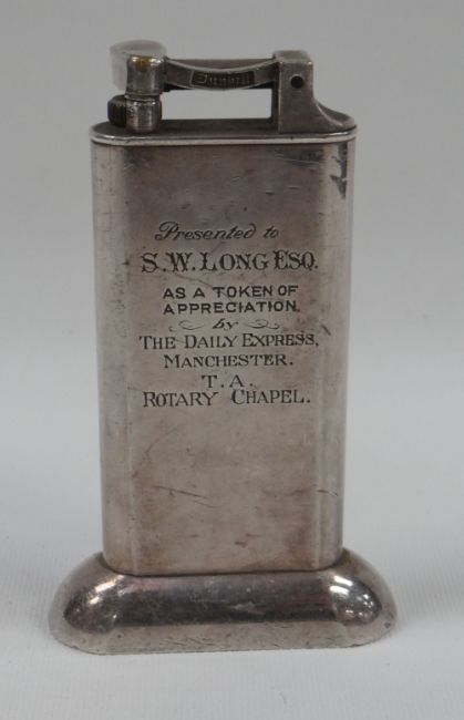 WHITE METAL TABLE-LIGHTER BY DUNHILLL engraved with the following 'Presented to S.W LOG ESQ AS A TOKEN OF APPRECIATION by THE DAILY EXPRESS MANCHESTER T.A ROTARY CHAPEL' 10cms high