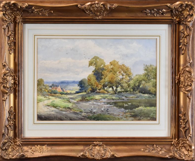 SYLVESTER STANNARD watercolour - geese walking toward a tree lined pond with farm buildings in distance, entitled verso 'By a Sussex Common', signed, 25 x 36cms