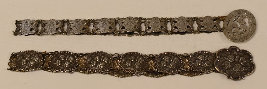 TWO VICTORIAN EPNS BELTS & BUCKLES, one with fourteen linked cameos of angels, the other in a floral design