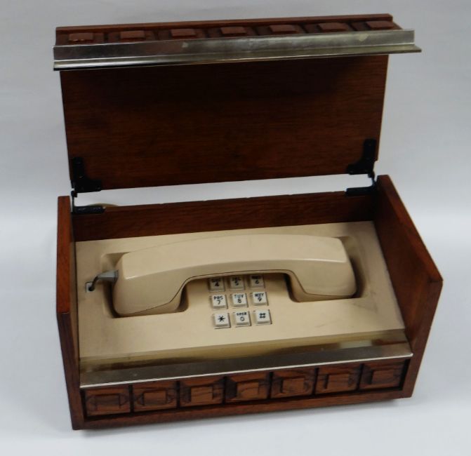 AN AMERICAN 'DESIGNER' TELEPHONE BY WESTERN ELECTRIC the plastic handset and phone with button dial concealed within in a hinged panelled oak casket, Serial No.49458, 28cms