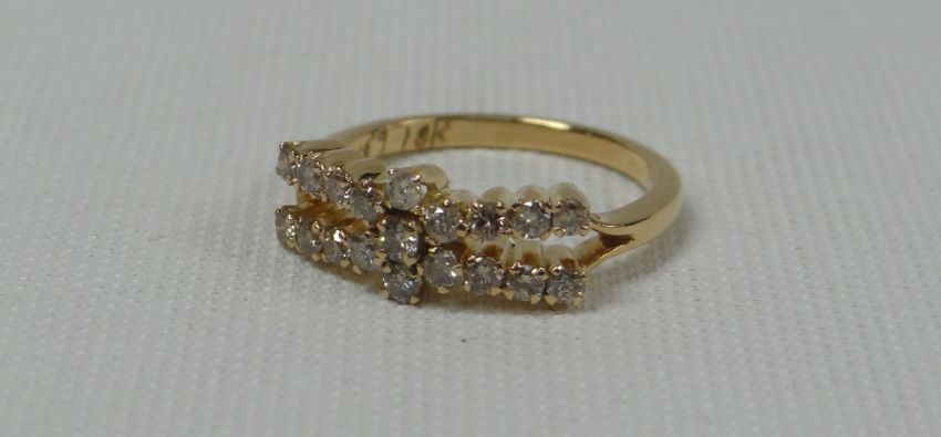 PRETTY 18ct 'OPEN BOW' RING set with nineteen good diamonds, 3.6gms