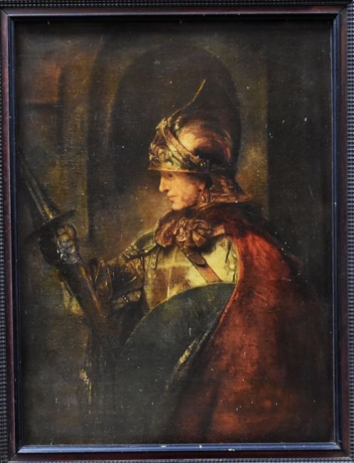 REMBRANDT print - helmeted Pre-Raphaelite style knight holding lance and shield, 62 x 47cms