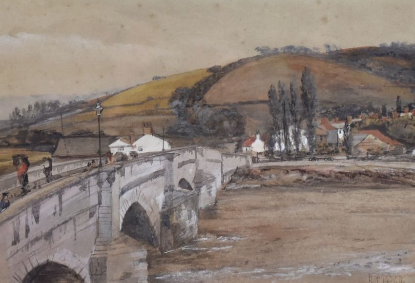 ROBERT THOMAS LANDELLS watercolour - three arched stone bridge over river with figures walking, signed, 17 x 24cms