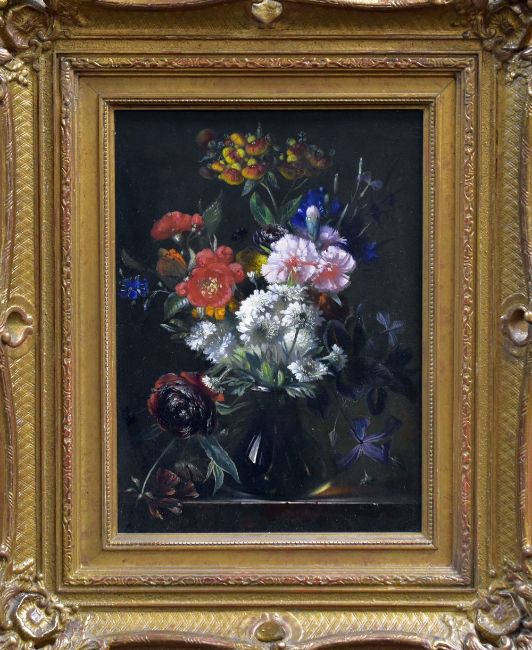 ARNOLDUS BLOEMERS (Dutch b.1792 d.1844) oil on board - still life study of various flowers in a vase on a table and with a single butterfly, signed with initials, 28 x 20cms