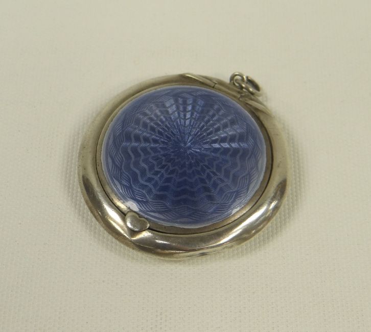 SILVER & GUILLOCHE ENAMEL COMPACT CASE of circular form with hinged lid, Birmingham 1922