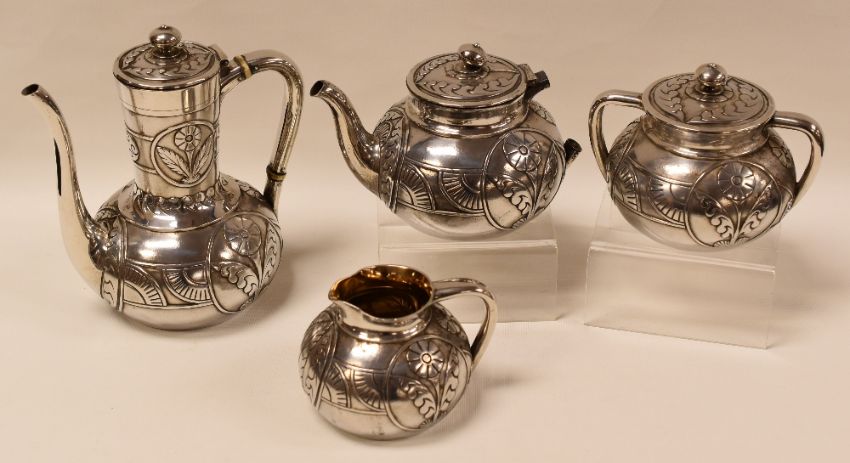 A FOUR-PIECE AMERICAN SILVER TEA-SET, decorated with raised stylised flowers and geometric motifs, marked 925 & Howard & Co, 38ozs