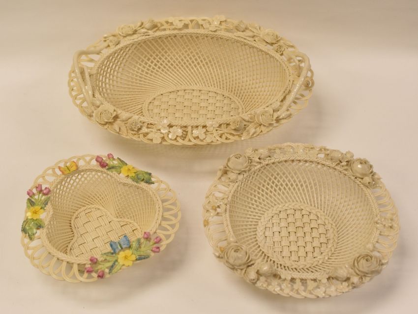 THREE BELLEEK BASKETS in typical form with applied flowers to the border comprising a large four-strand twin-handled oval version, 33cms long; a 1st period (late nineteenth century) three strand circular version, 23cms diam; and a Millenium 2000 version with coloured flowers