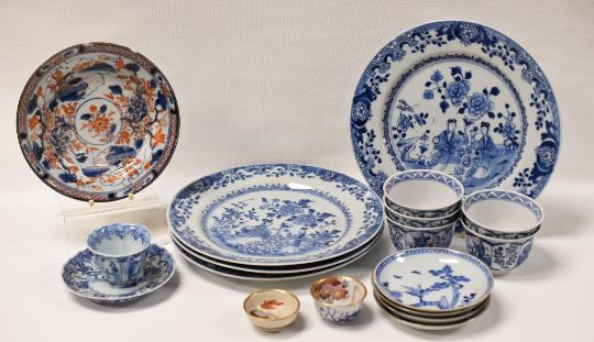A PARCEL OF ANTIQUE ORIENTAL PORCELAIN comprising four blue and white Chinese plates, 23cms plates, a set of five Chinese blue and white tea bowls, four matching Chinese blue and white dishes, 11cms diam, a tea bowl and saucer (damage) etc