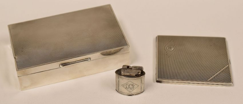MACHINE TURNED SILVER CIGARETTE CASE, A SIMILAR CIGARETTE BOX & A SILVER LIGHTER, the cigarette case with monogrammed motif, 5ozs; the box of plain form and wood-lined, the lighter monogrammed and marked 'silver'