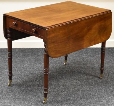 AN ANTIQUE MAHOGANY PEMBROKE TABLE on turned legs with castors, drawer to one end, 88 x 73 cms