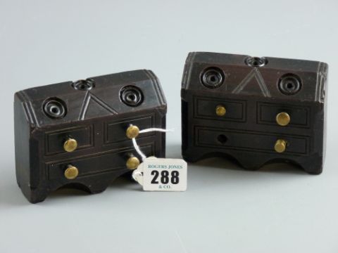 A pair of Welsh carved slate miniature bureaus with brass knobs, 8 x 10 cms approximately (chipped with losses including one brass drawer knob)