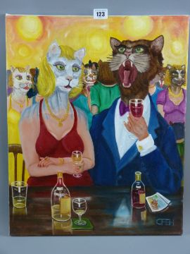 CARL F HODGSON acrylic on canvas - two figures in evening dress at a table drinking wine, each depicted as a cat, monogrammed and entitled verso 'What a Bore', 50 x 40 cms