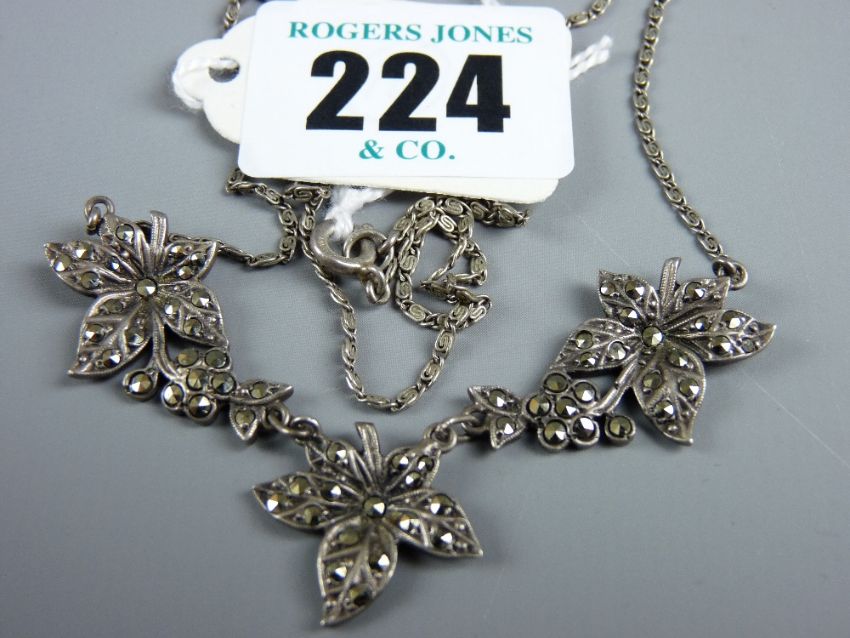 A silver necklet with triple floral marcasite pendant, 8.4 grms
