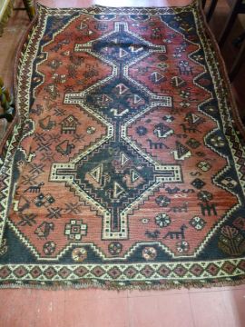 A Persian Shiraz village rug with traditional design including animals and trees, 225 x 155 cms